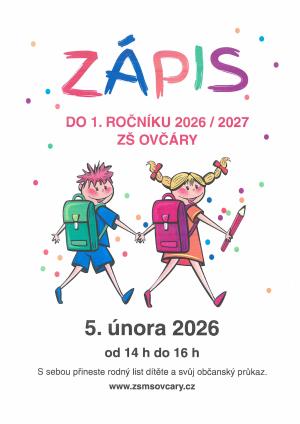Základní škola Ovčáry informuje o konání zápisu do 1. ročníku pro školní rok 2026/2027.