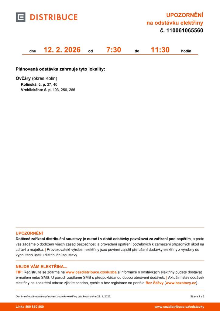 Dne 12. února 2026 dojde k plánované odstávce elektřiny v několika lokalitách v obci Ovčáry, okres Kolín. Odstávka se bude konat od 7:30 do 13:30 hodin. U dotčených adres se časy odstávky mění. V době odstávky je třeba považovat zařízení za pod napětím a dodržovat bezpečnostní opatření. Pro více informací o odstávkách se můžete registrovat na webu distribuční společnosti nebo využít portál Bez Šťávy pro aktuální stav dodávek.