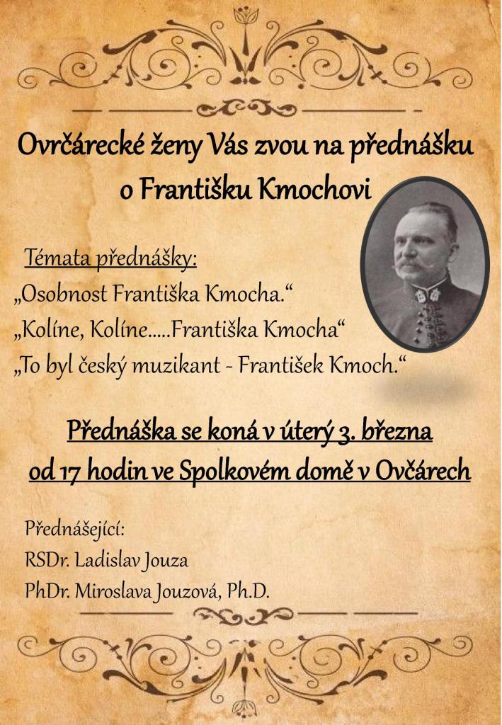 Zveme vás na přednášku věnovanou významnému českému muzikantovi Františku Kmochovi, která se uskuteční v úterý 3. března. Přednášku povedou odborníci RSDr. Ladislav Jouza a PhDr. Miroslava Jouzová, Ph.D. Na programu budou zajímavá témata, jako jsou „Osobnost Františka Kmocha“, „Kolíne, Kolíne.... Františka Kmocha“ a další. Těšíme se na vaši účast.